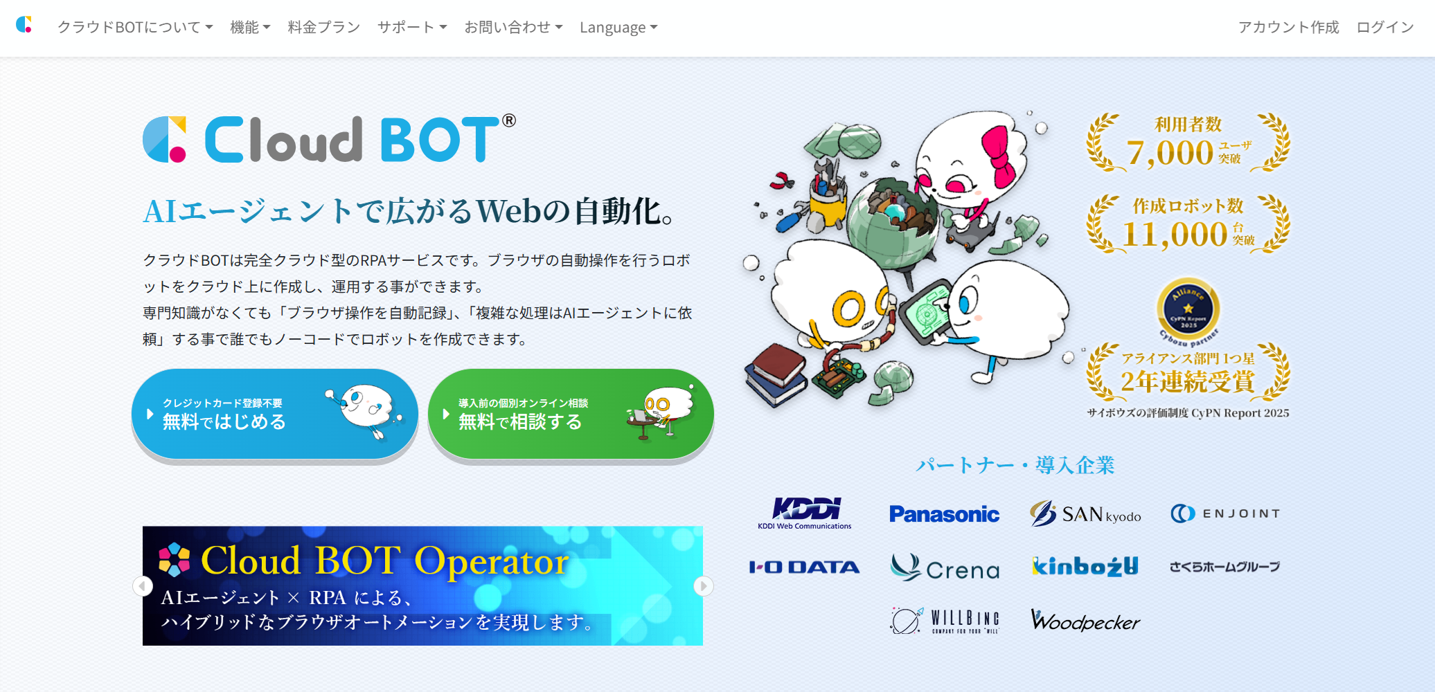 - AIとの歩み寄り: RPAのシナリオ内でChatGPT、Geminiなどを呼び出せる。生成AIを利用するためにユーザが別途契約する必要がない。RPAだいけでなく、自動判断で操作を行うAIエージェント「Cloud BOT Operator」が自動化の範囲を飛躍的に広げます。