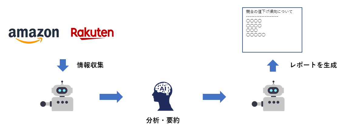 - RPAの役割(画面操作): 指定した複数のWebサイト(Amazon、楽天、競合HPなど)を巡回し、価格、レビュー、新製品情報などのテキストデータをスクレイピング(抽出)します。