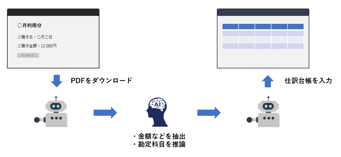 システムへの実行(RPA):AIが加工したデータをもとに、会計ソフトや顧客管理システムへ自動で入力する。