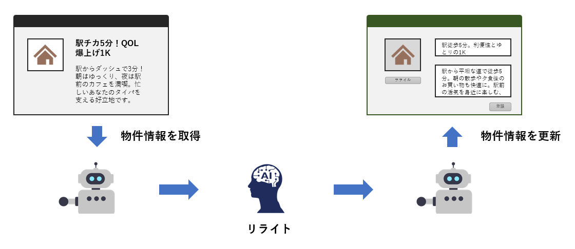 - 連携後の動き: RPAが自社の物件登録システムやCMS(Wordpressなど)のブラウザ画面を開き、新しく生成された文章を各項目に自動入力します。