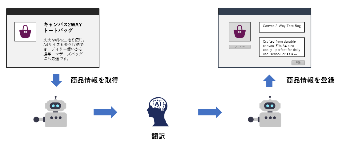 - 連携後の動き: RPAがAIの作成した現地語の紹介文を、海外サイトのブラウザ画面へ自動入力して出品します。