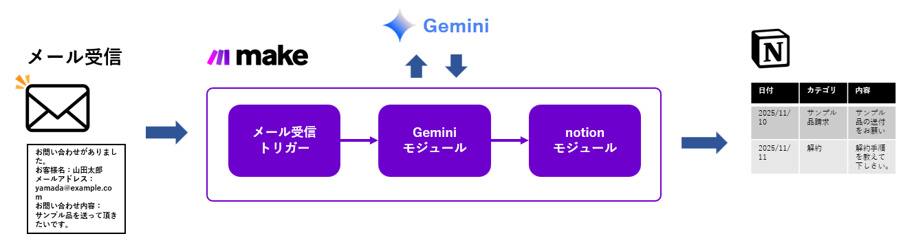 解決策: Make × Notion × Geminiで、お問い合わせの分類と返信作業を自動化