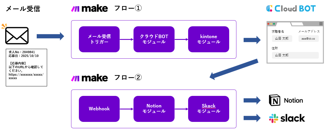 そこで導入したのが、Make × クラウドBOT × Notion × Slack を組み合わせた自動化フローです。
