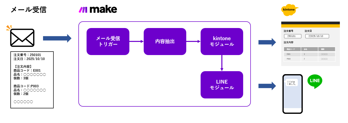 同社は、iPaaS「Make」 と 業務アプリ「kintone」、そして LINE通知 を組み合わせることで、注文処理を自動化。