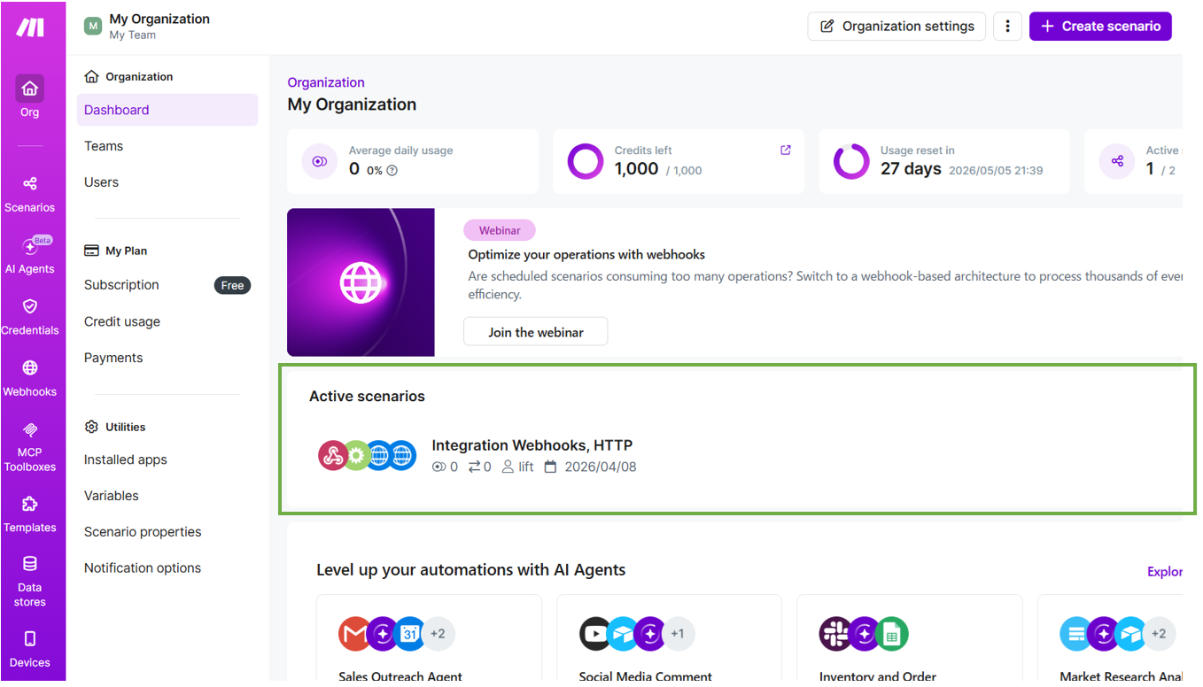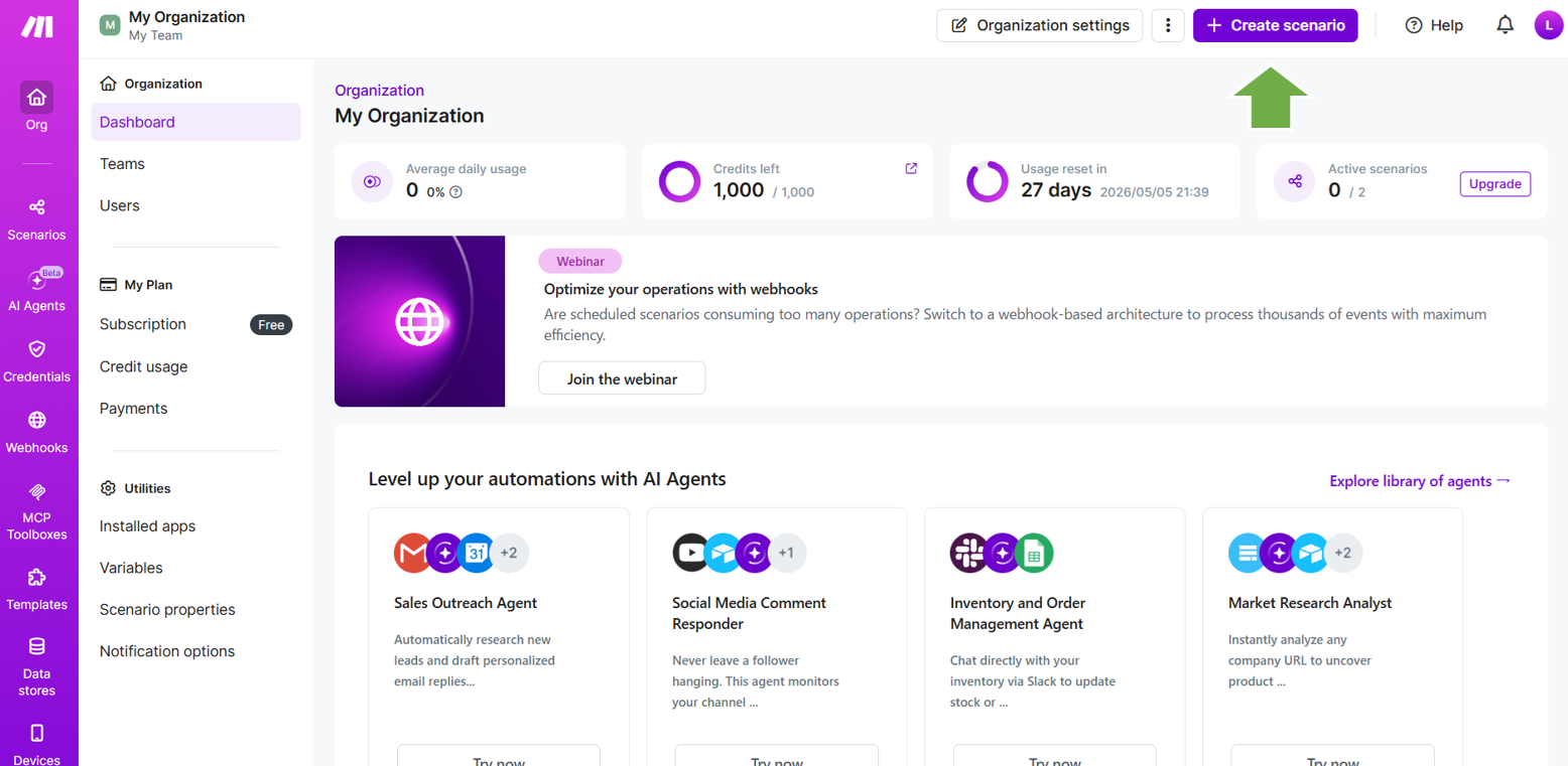 Makeにログインし、ダッシュボード画面の「Crate scenario」をクリックします。