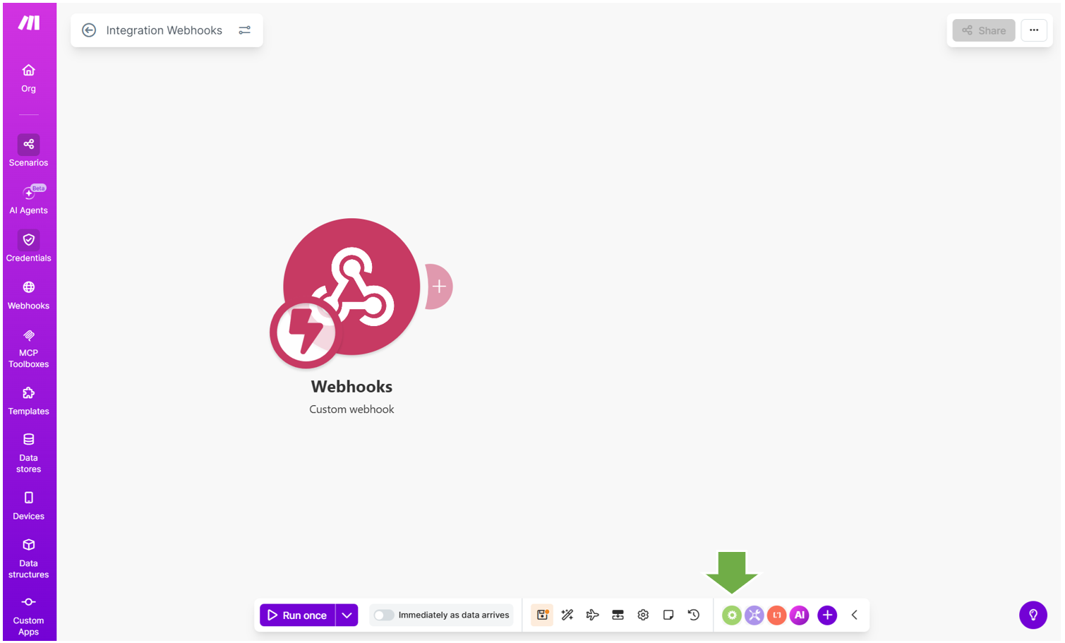 画面にWebhooksのアイコンが追加されます。Makeではこのアイコンを”モジュール”と呼びます。