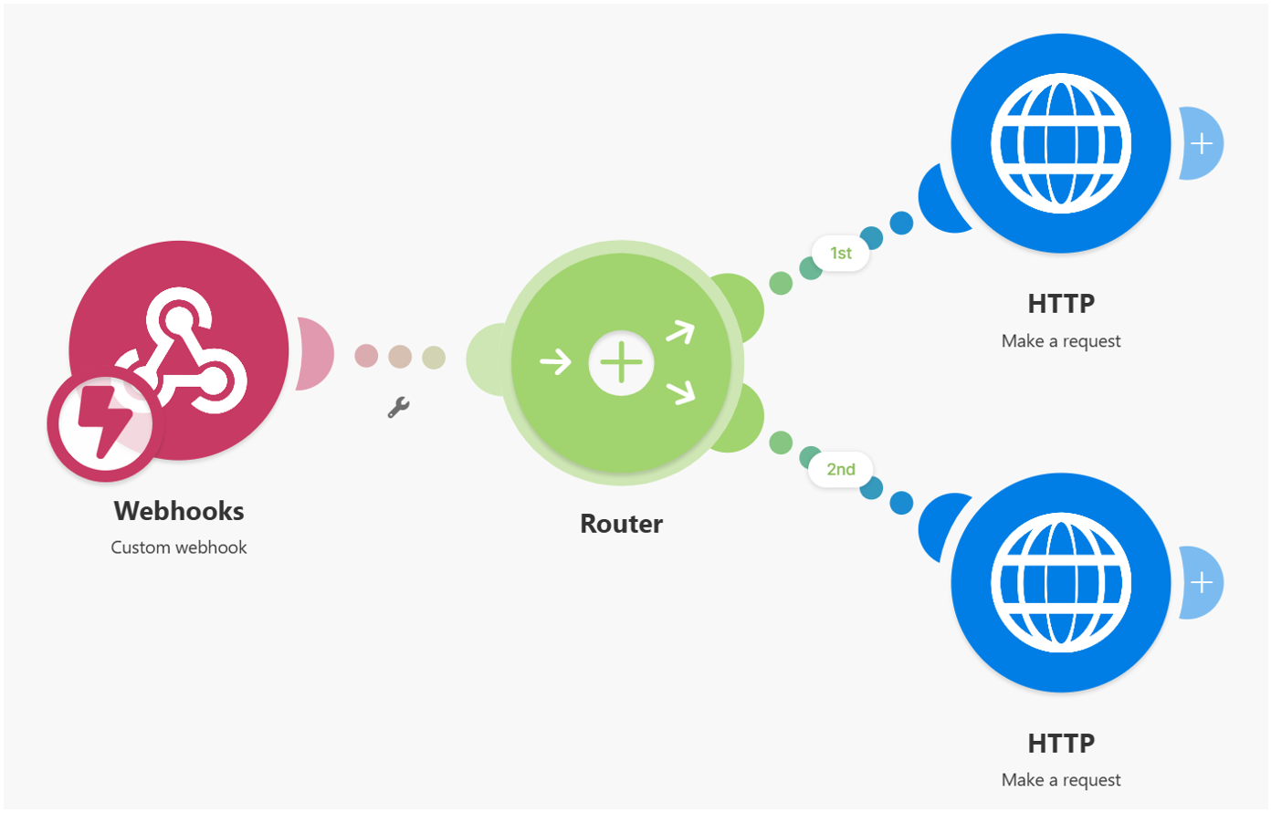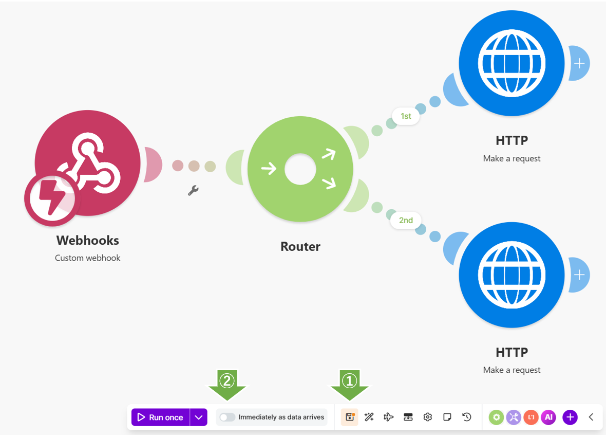 これで、MakeがWebhookを受信すると、2つのURLにWebhookを送信するフローが完成しました。