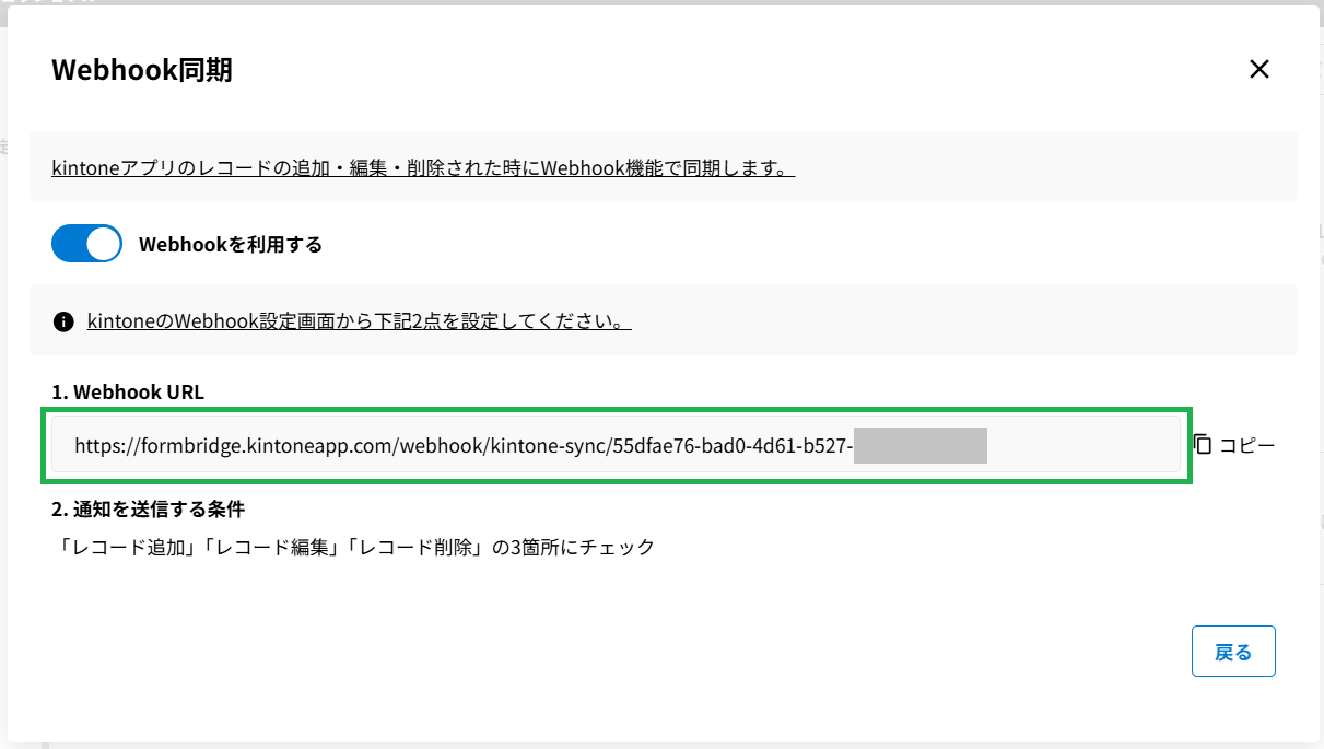 ここに、kViewerやformBridgeで発行される、同期用のWebhook URLを入力します。