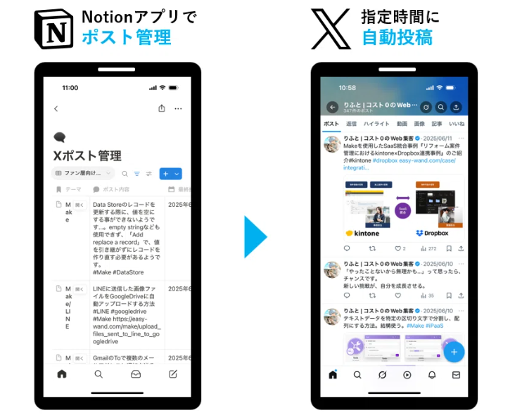 近年注目を集めているのが、Google Apps Scriptを用いてX(Twitter)のAPIとNotionデータベースを連携させ、Notion上で管理したポスト内容を定期的にXへ自動投稿する仕組みです。