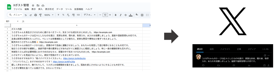 最もよく紹介されているのが、スプレッドシートに投稿内容を一覧管理し、GASで定期実行する方法です。Googleアカウントさえあれば無料で実装でき、テキスト投稿の自動化自体はこの方法で実現できます。