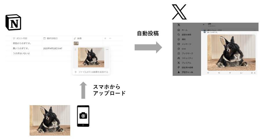 画像投稿はXでのエンゲージメントを高める重要要素ですが、従来のスプレッドシート型だと手間が大きい弱点がありました。Notion×GAS自動投稿では、Notionデータベースに画像ファイルをそのまま添付できるため、煩雑なリンク取得などが不要でスムーズに画像ポストを行えます。例えばスマホで撮った商品写真を即座にNotionアプリからアップロードし、そのまま次回以降の自動投稿に組み込む、といった運用も簡単です。